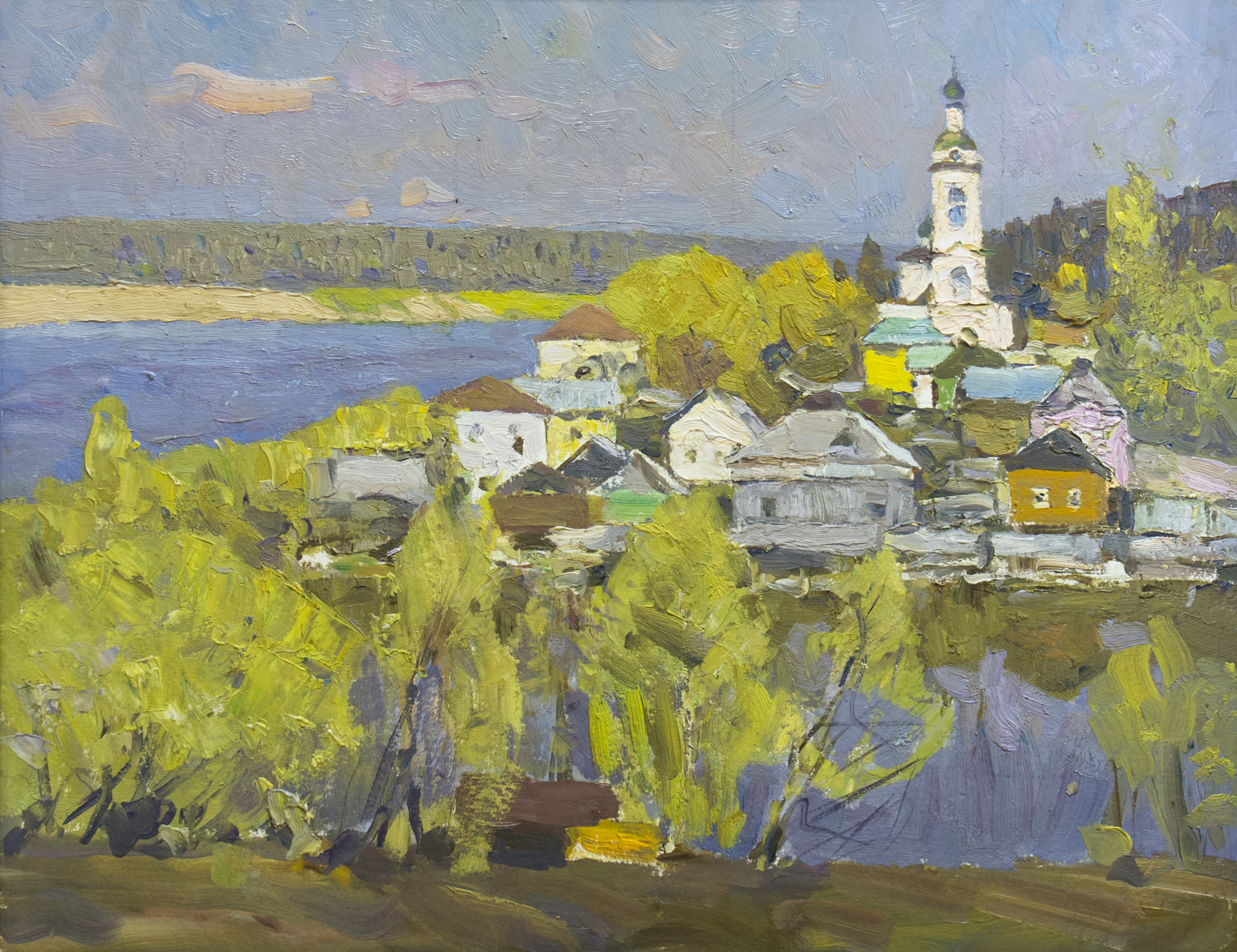 На картине «Весенний Плёс» изображён вид с Соборной горы на Заречье, ставший своеобразной «визитной карточкой» Плёса. Его снимают фотографы и кинооператоры, любят изображать художники, однако привычная панорама с её архитектурной доминантой – колокольней Варваринской церкви – и разноцветными домиками вокруг неё не надоедает, каждый сезон и каждую минуту она - другая.